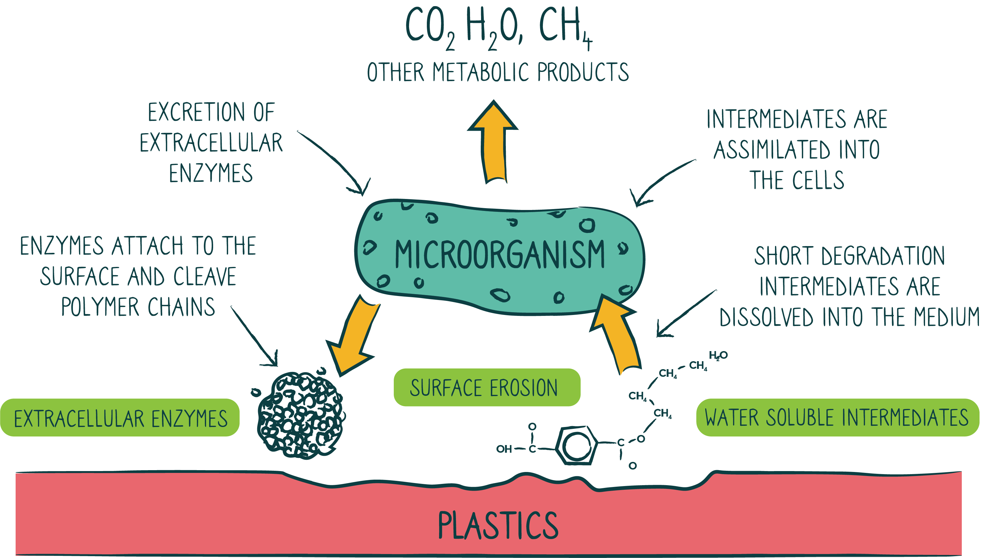 - Biodegradation of plastic is achieved by enabling microorganisms to metabolize (i.e. break down) the molecular structure of the plastic, which produces a humus-like material (organic matter) which is a natural plant fertiliser and a biogas