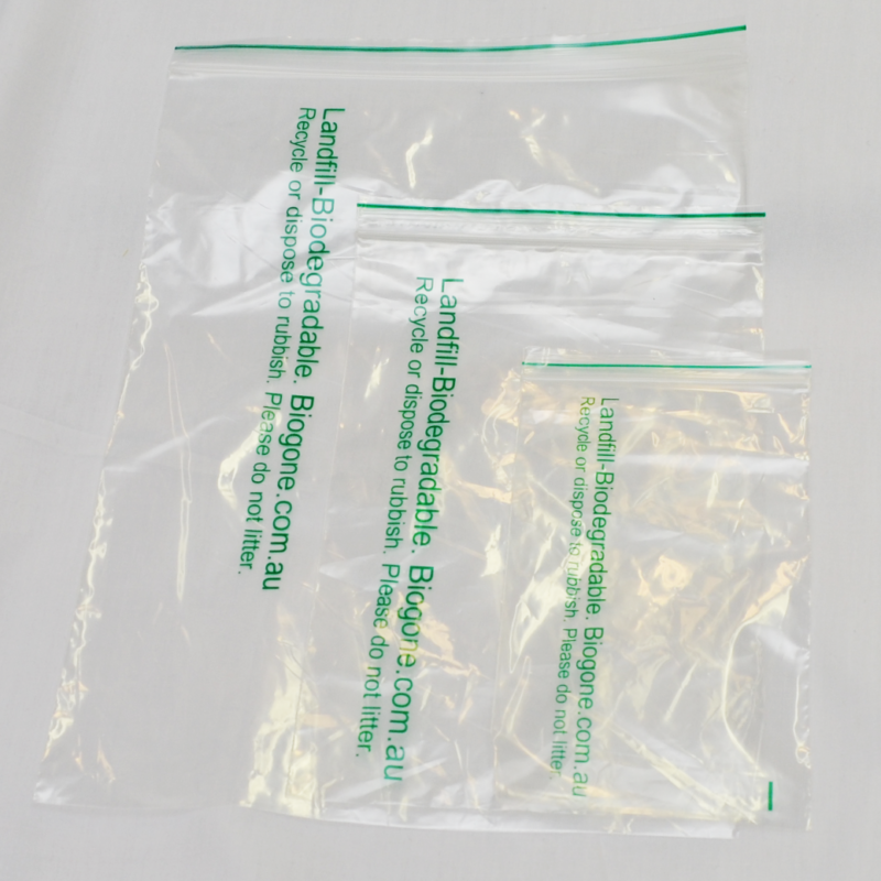 - Ziplock bags with the green text written on the side to identify them as landfill-biodegradable bags.